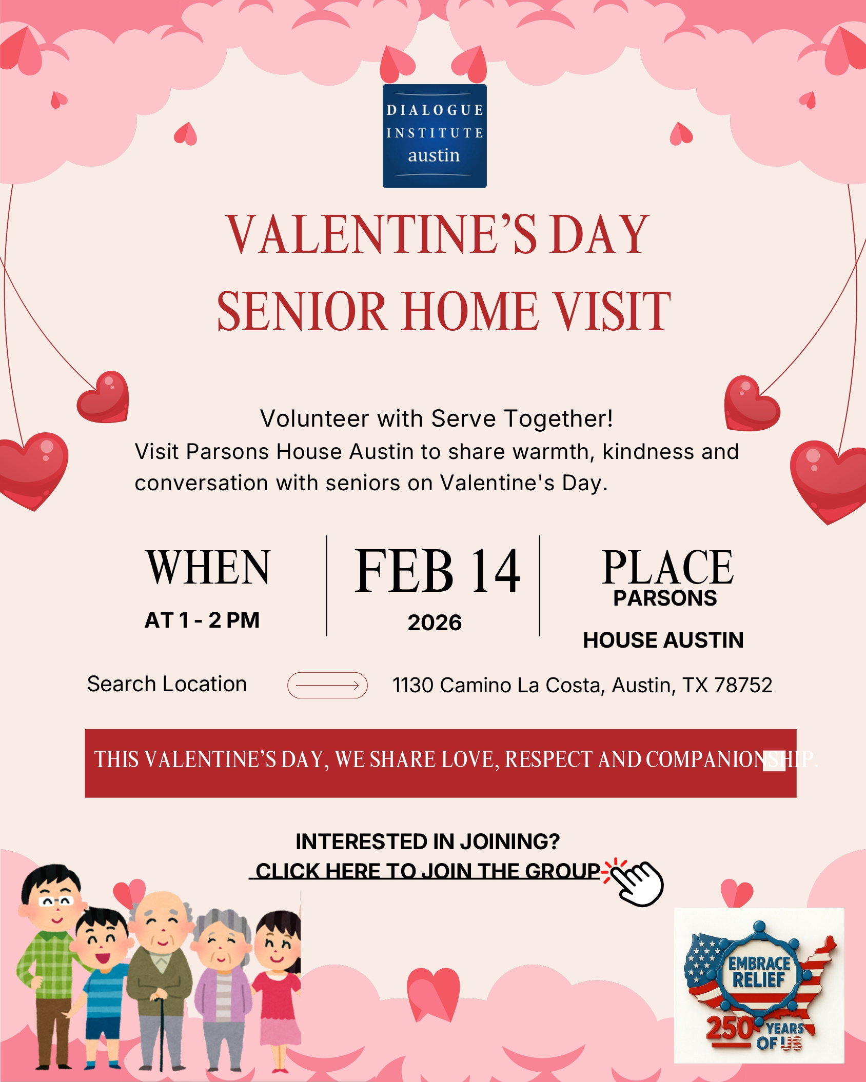 Dialogue Institute Austin Parsons House Austin, 1130 Camino La Costa, AustinVolunteer with Serve Together! Visit Parsons House Austin to share warmth, kindness, and conversation with seniors on Valentine's Day.