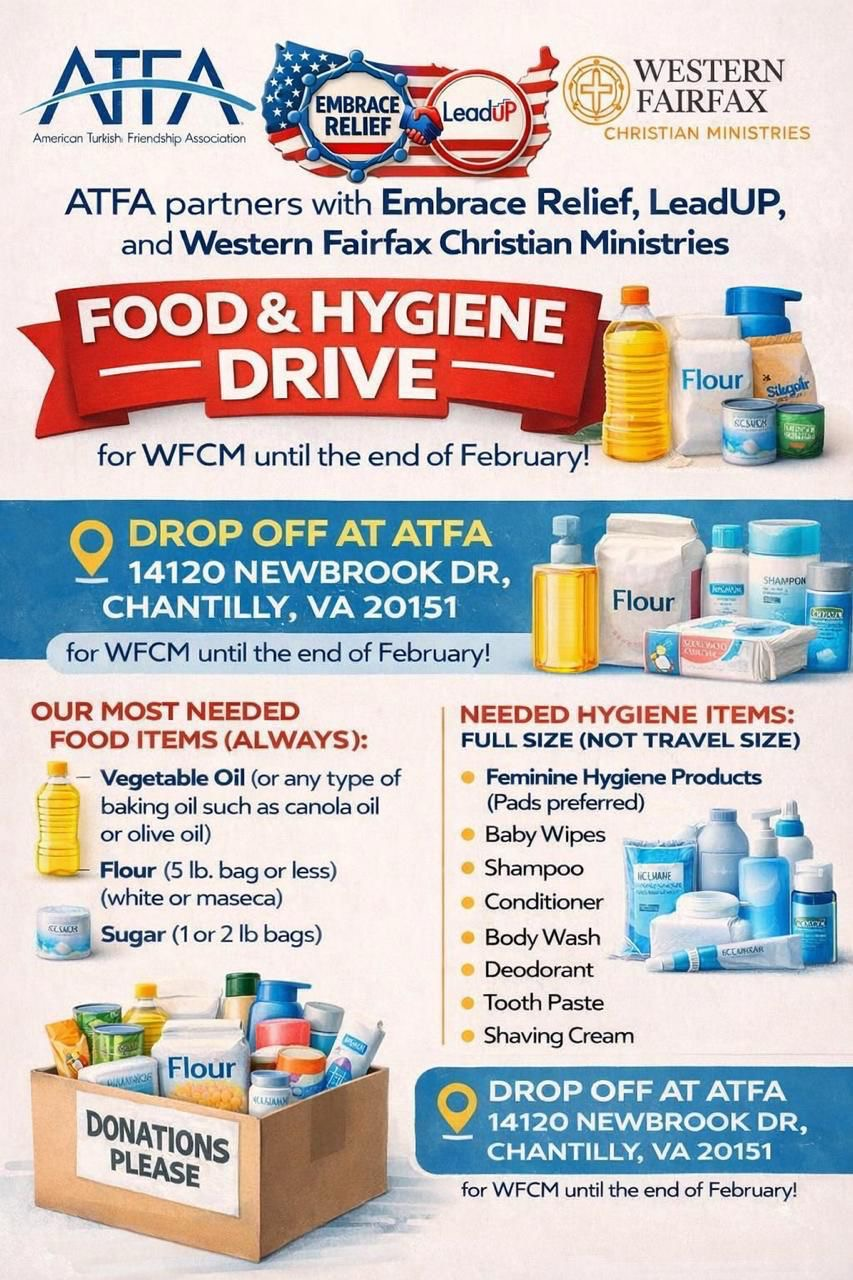 ATFA (American Turkish Friendship Association) 14120 Newbrook Dr, ChantillyJoin us in supporting the community! ATFA partners with Embrace Relief, LeadUP, and Western Fairfax Christian Ministries for a Food & Hygiene Drive. Help those in need by donating food […]