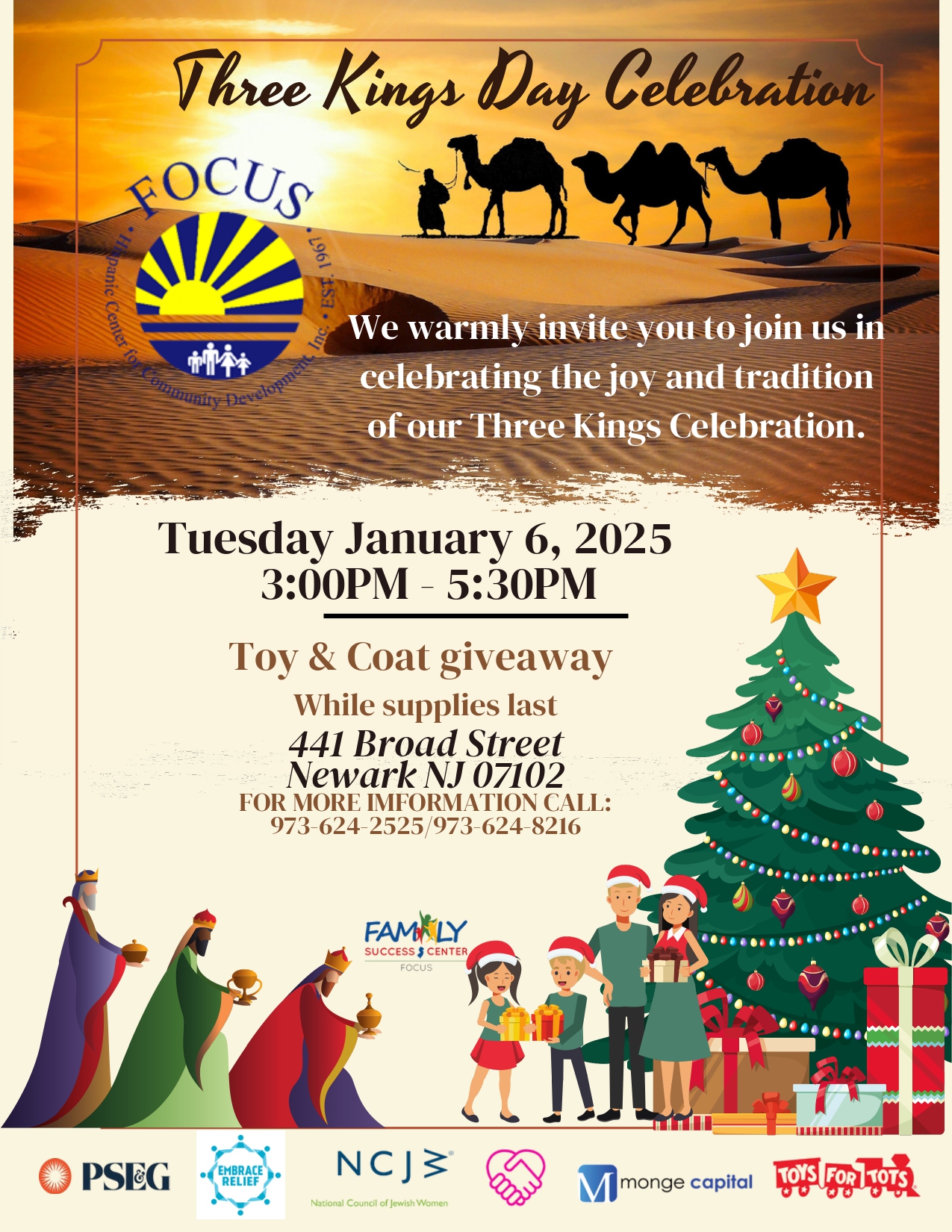 Jan 6 Three Kings Day Celebration 3:00 pm - 5:30 pm Toy & Coat Giveaway 441 Broad Street, Newark Event Details Get Directions