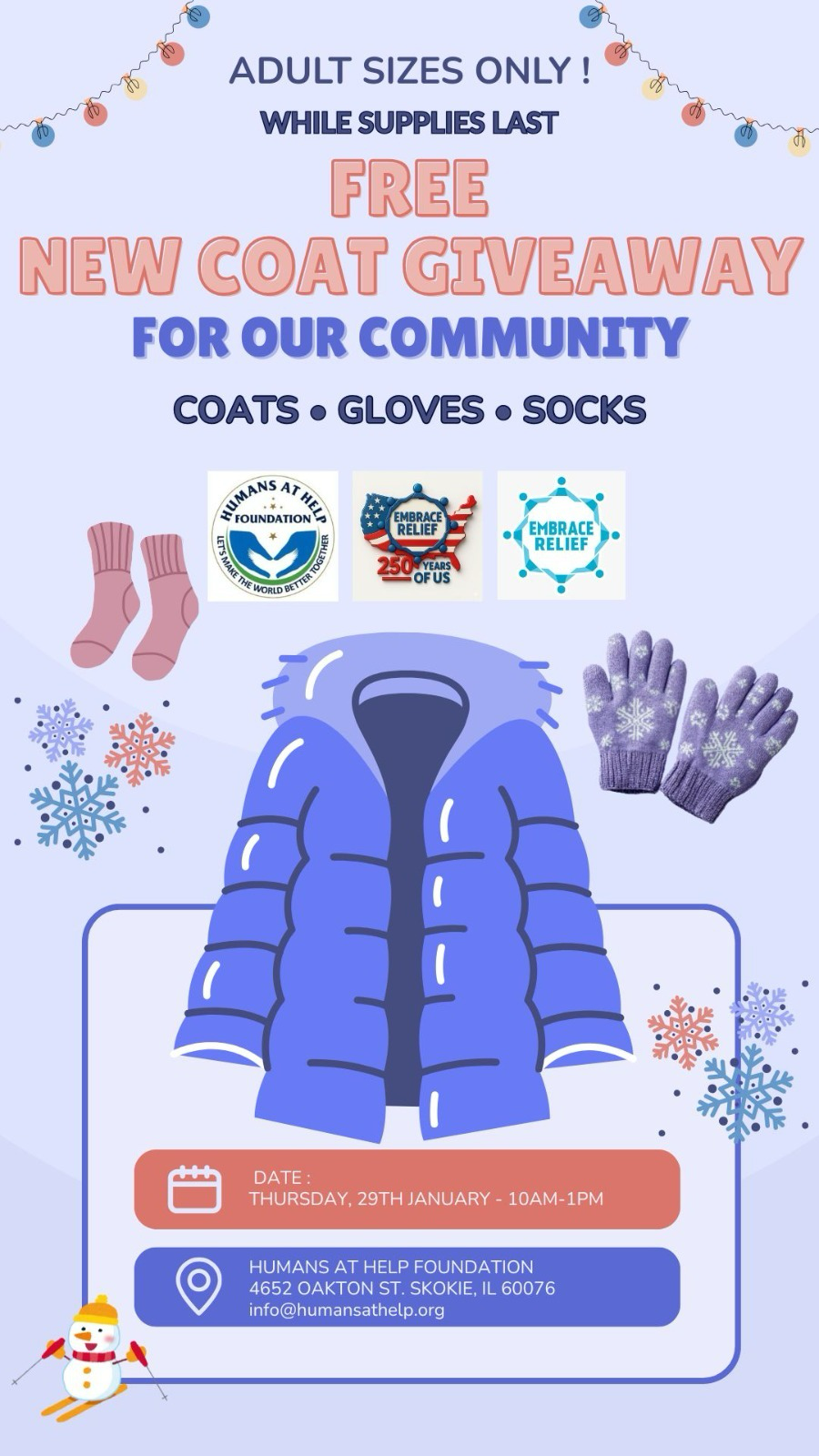 Jan 29 FREE WINTER CLOTHING GIVEAWAY FOR OUR COMMUNITY 10:00 am - 1:00 pm Humans at Help Foundation 4652 Oakton St, Skokie, IL 60076, Skokie Event Details Get Directions