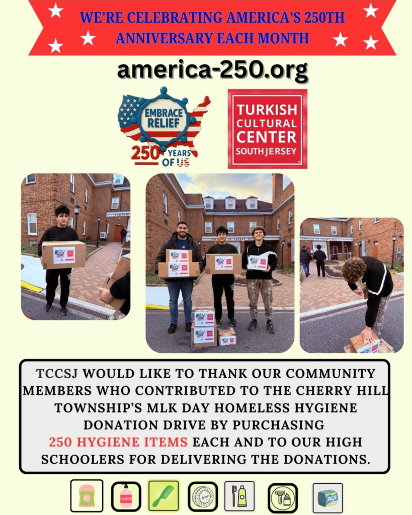 On this special day of service, community members in South Jersey, with the help of America-250 and the Turkish Cultural Center of South Jersey, came together with one shared goal: to give with intention and lead with heart. Families, individuals, and supporters stepped up by generously purchasing hygiene items—250 items at a time—understanding that these essentials are often the difference between hardship and dignity for those facing difficult circumstances.